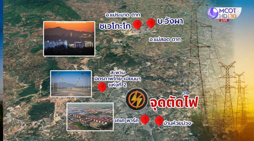 จุดนี้อยู่ในพื้นที่ชเวก๊กโก่ ยังคงมีแสงไฟฟ้าทั่วบริเวณอยู่ คาดว่าเป็นไฟฟ้าจากเครื่องปั่นไฟและโซลาร์เซลล์ ซึ่งมีการเตรียมการรองรับไว้ล่วงหน้าพอสมควร จริงๆ แล้วการตัดไฟฟ้าจากไทยที่ข้ามไปฝั่งเมียนมา ไม่ใช่ครั้งแรก เพราะก่อนหน้านี้เมื่อปี 66 ทางการไฟฟ้าส่วนภูมิภาค หรือ PEA ได้ตัดการจ่ายไฟฟ้าจากฝั่งไทยที่บ้านวังผา อ.แม่ระมาด ที่เชื่อมไปยังบ้านก๊กโก่ ฝั่งเมียวดี โดยตรง รวมทั้งที่จุดบ้านแม่กุใหม่ท่าซุง ต.แม่กุ อยู่ทางใต้ของ อ.แม่สอด ตรงข้ามเคเคปาร์ค ซึ่งถูกระบุว่าเป็นเขตจีนเทาดำที่เป็นแหล่งรวมของเหล่าสแกมเมอร์จากทั่วโลกมาแล้ว แต่ทางการข่าวยังพบว่ามีการลากสายไฟเชื่อมโยงไฟฟ้าจากฝั่งไทยไปยังพื้นที่บางส่วนของกลุ่มจีนเทา จึงต้องตัดไฟฟ้าในวันนี้อีก 2 จุด