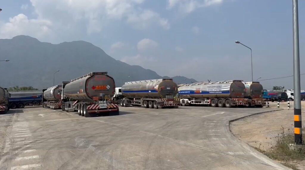 กรณีงดส่งออกน้ำมันเชื้อเพลิง พบว่าประชาชนยังคงนำรถไปเติมน้ำมันเชื้อเพลิงตามปั๊มต่างๆ อย่างต่อเนื่อง แต่มาตรการห้ามส่งออกน้ำมัน ตอนนี้ไม่เพียงแต่ในฝั่งเมียนมา ที่น้ำมันมีราคาสูงขึ้น ในฝั่งไทย ภาคการขนส่งก็ได้รับผลกระทบ โดยพบว่ารถขนส่งน้ำมันกว่า 40 คัน จอดรอบริเวณที่พักกรมทางหลวง บ้านน้ำจำ อ.แม่สาย จ.เชียงราย หลังไม่สามารถส่งน้ำมันไปจังหวัดท่าขี้เหล็กได้ เป็นไปตามมติสภาความมั่นคงแห่งชาติ