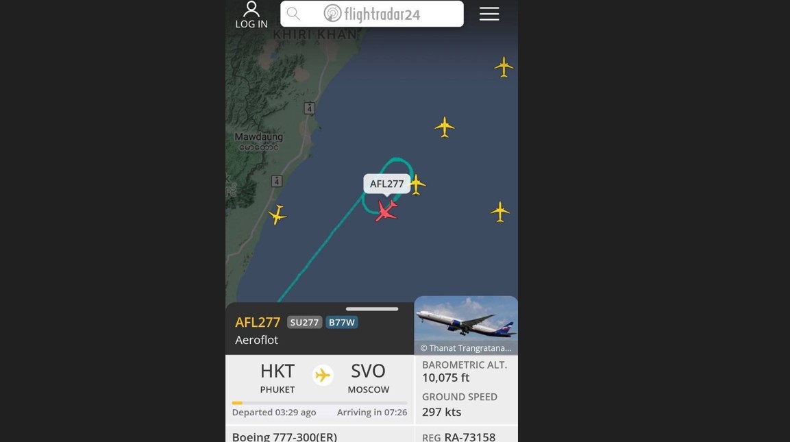 หลังจากบินวนกลางทะเลอันดามัน เกือบ 3 ชั่วโมง สำหรับเที่ยวบิน 777-300ER ของสายการบิน Aeroflot ที่ขึ้นจากภูเก็ตไปมอสโก คาดเกิดปัญหา ยังไม่มุ่งหน้าปลายทาง