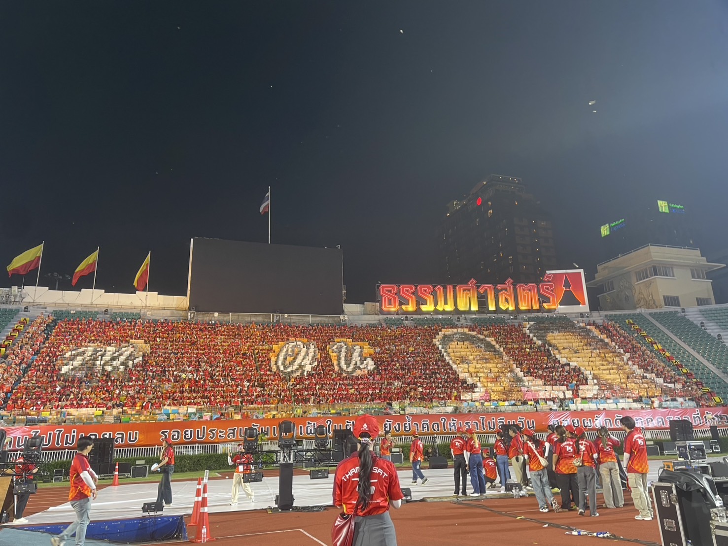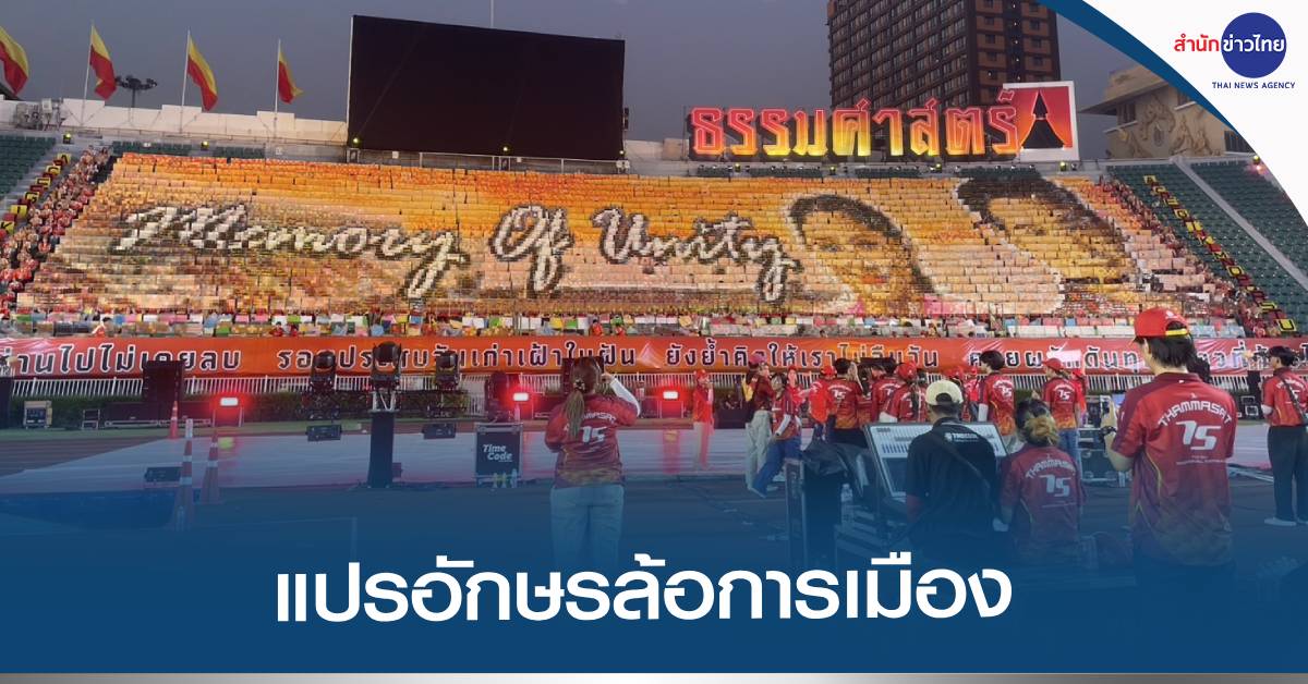 สนามศุภชลาศัย 15 ก.พ. – “ธรรมศาสตร์” แปรอักษรล้อการเมือง หลังงานบอลจบ เหน็บ MOU ขึ้นภาพคู่ “แพทองธาร-พิธา” บอกเป็นผู้นำฝ่ายบริหาร-ฝ่ายค้าน วิจารณ์นโยบายรัฐบาล “บ้านเพื่อคนไทย-คอนโดเพื่อคนจีน” แถมแซะน้ำท่วมต้องรอ “เมียคนใต้” พร้อมถาม “โทนี่” กลับมาได้ไง