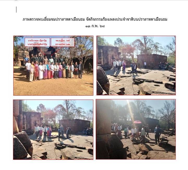 นายภูมิธรรม เวชยชัย รองนายกรัฐมนตรีและรัฐมนตรีว่าการกระทรวงกลาโหม กล่าวถึง กรณีที่มีชาวกัมพูชาจำนวนหนึ่ง ขึ้นมาร้องเพลงปลุกใจ บริเวณปราสาทตาเมือนธม อ.พนมดงรัก จ.สุรินทร์ ว่าจริงๆ พื้นที่ตรงนี้อยู่ในประเทศไทย แต่ยังมีเส้นที่ยังแบ่งกันไม่ชัดเจน ก็ยังเป็นเรื่องค้างคาอยู่ ซึ่งเราก็เปิดให้ฝ่ายกัมพูชา ประชาชน ขึ้นไปสักการะ สิ่งต่างๆ ได้ เป็นวัดปกติ