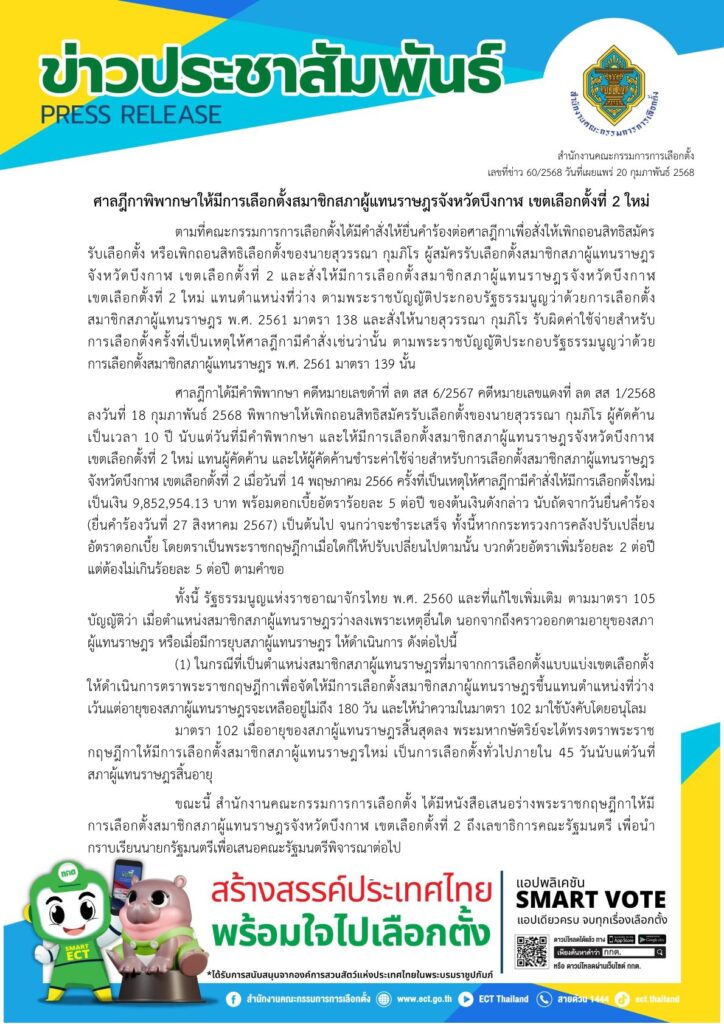 กกต. 20 ก.พ.- กกต.เสนอ ครม.ออกพระราชกฤษฎีกาเลือกตั้งใหม่ สส. เขต 2 บึงกาฬ หลังศาลฎีกามีคำพิพากษา พร้อมสั่งเพิกถอนสิทธิและให้ “สุวรรณา กุมภิโร” ชดใช้ค่าเลือกตั้งเกือบ 10 ล้านบาท