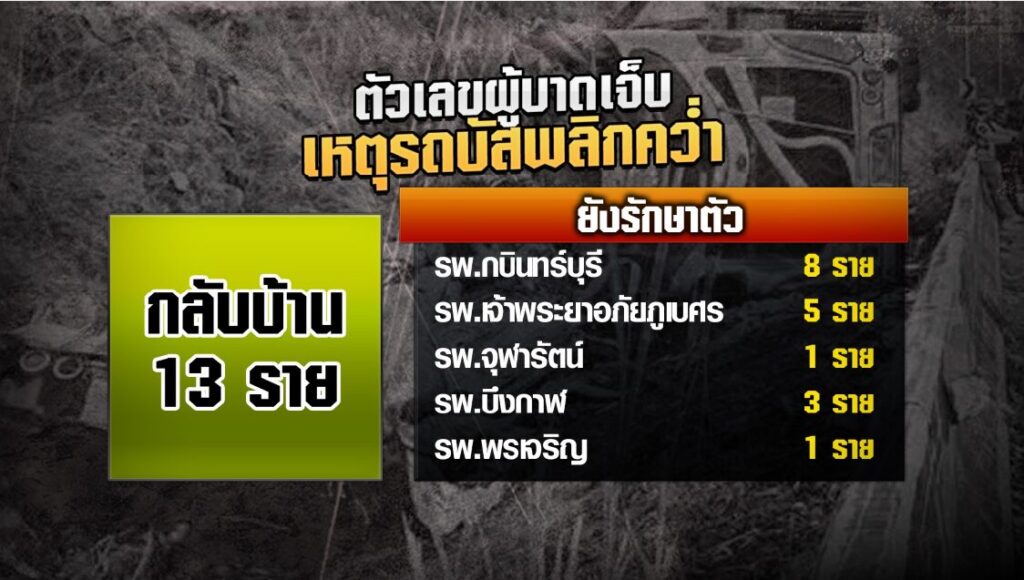 ล่าสุดผู้บาดเจ็บ 13 ราย สามารถกลับบ้านได้แล้ว ส่วนอีก 18 ราย ยังคงรักษาตัวที่โรงพยาบาลต่างๆ ได้แก่ โรงพยาบาลกบินทร์บุรี 8 ราย โรงพยาบาลเจ้าพระยาอภัยภูเบศร 5 ราย โรงพยาบาลจุฬารัตน์ 1 ราย โรงพยาบาลบึงกาฬ 3 ราย และโรงพยาบาลพรเจริญ 1 ราย.-สำนักข่าวไทย