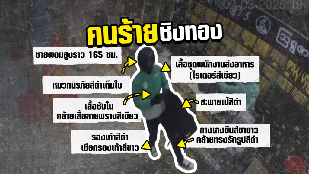 จากการตรวจสอบภาพวงจรปิดพบว่าคนร้ายเป็นชายรูปร่างผอมสูงราว 165-170 ซม. สวมหมวกนิรภัยสีดำแบบเต็มใบอำพรางใบหน้ามิดชิด สวมเสื้อชุดพนักงานส่งอาหารหรือไรเดอร์สีเขียว สวมเสื้อซับในคล้ายเสื้อลายพรางสีเขียว สวมกางเกงยีนส์ขายาวคล้ายทรงรัดรูปสีดำ สวมรองเท้าสีดำ เชือกมัดรองเท้าสีขาว และด้านหลังคนร้ายสะพายกระเป๋าเป้สีดำขนาดใหญ่