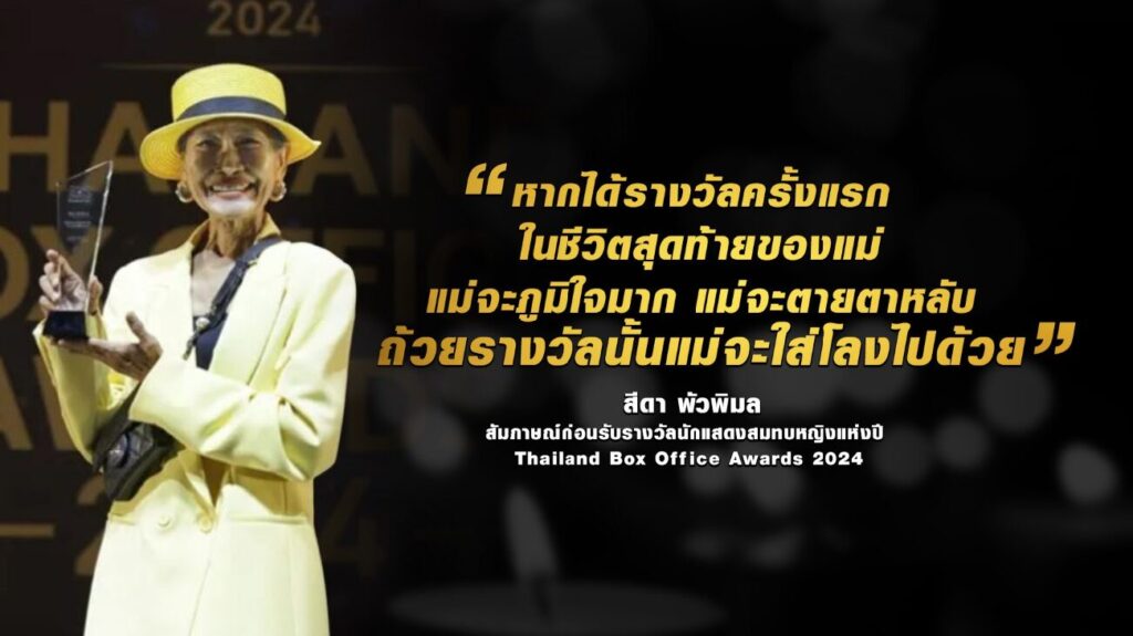 “แม่สีดา” เคยให้สัมภาษณ์ ก่อนรับรางวัลนักแสดงสมทบหญิงแห่ง ปี Thailand Box Office Awards 2024 จากบท “แม่แสง” ในภาพยนตร์ “วิมานหนาม” เธอบอกว่า 46 ปีที่อยู่ในวงการบันเทิง ไม่เคยได้รับรางวัลใดๆ หากได้รางวัลครั้งแรกในชีวิตสุดท้ายของแม่ ตอนนี้ 70 แล้ว แม่จะภูมิใจมาก แม่จะตายตาหลับ ถ้วยรางวัลนั้นแม่จะใส่โลงไปด้วย มันแทนดอกไม้ เหมือนที่ลูกเราได้ และเราขึ้นไปรับ มันเหมือนประกาศนียบัตรของแม่”.-สำนักข่าวไทย