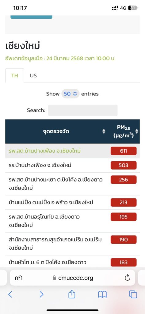 โดยค่าฝุ่นพิษรายชั่วโมงเช้านี้ ศูนย์ข้อมูลการเปลี่ยนแปลงสภาพภูมิอากาศ มหาวิทยาลัยเชียงใหม่ หรือ cmuccdc รายงานค่าฝุ่นพิษ PM2.5 รายชั่วโมง เมื่อเวลา 10.00 น. สูงสุดอยู่ที่ 611 ไมโครกรัมต่อลูกบาศก์เมตร ที่โรงพยาบาลส่งเสริมสุขภาพตำบลบ้านปางเฟือง คุณภาพอากาศที่มีผลกระทบต่อสุขภาพมาก และที่โรงพยาบาลส่งเสริมสุขภาพตำบลบ้านปางมะเยา ตำบลปิงโค้ง อำเภอเชียงดาว จ.เชียงใหม่ สูง 256 ไมโครกรัมต่อลูกบาศก์เมตร ซึ่งเป็นคุณภาพอากาศที่มีผลกระทบต่อสุขภาพมาก ส่วนในอำเภอเมืองค่าฝุ่นสูงสุดรายชั่วโมง อยู่ที่ 177 ไมโครกรัมต่อลูกบาศก์เมตร ซึ่งส่งผลกระทบต่อสุขภาพมากเช่นเดียวกัน