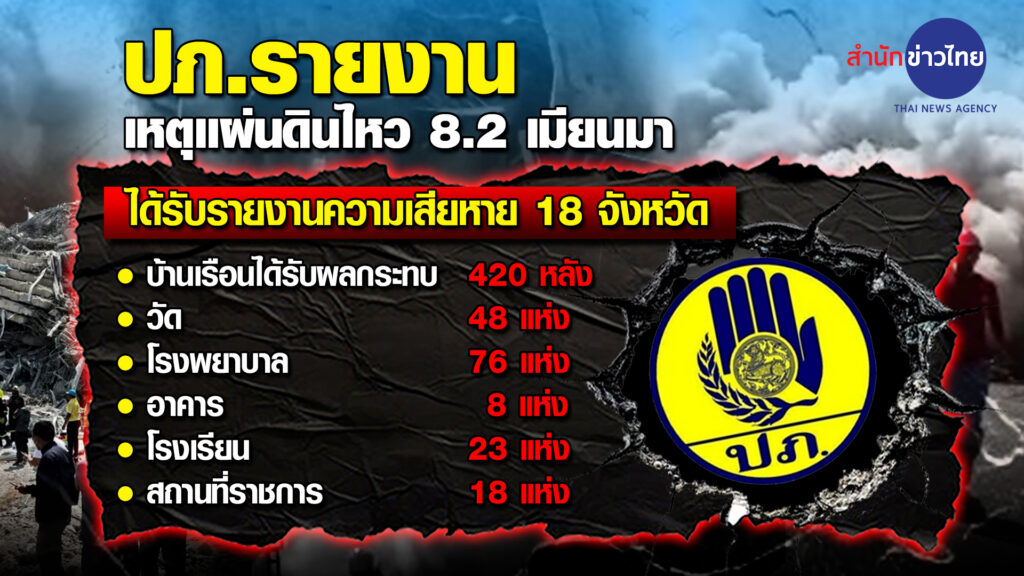นายภาสกร บุญญลักษม์ อธิบดีกรมป้องกันและบรรเทาสาธารณภัย ในฐานะเลขานุการกองบัญชาการป้องกันและบรรเทาสาธารณภัยแห่งชาติ เปิดเผยว่า จากสถานการณ์แผ่นดินไหวที่เกิดขึ้นเมื่อวันที่ 28 มี.ค. 68 ซึ่งมีสาเหตุจากการเลื่อนตัวกลุ่มรอยเลื่อนสะกาย สาธารณัฐแห่งสหภาพเมียนมา ขนาด 8.2 ความลึก 10 กม. ที่ละติจูด 21.682 องศาเหนือ ลองจิจูด 96.121 องศาตะวันออก บริเวณประเทศเมียนมา ห่างจาก อ.ปางมะผ้า จ.แม่ฮ่องสอน ไปทางทิศตะวันตกเฉียงเหนือ ประมาณ 326 กม. สามารถรับรู้แรงสั่นไหวได้ในพื้นที่ รวม 63 จังหวัด (ข้อมูลวันที่ 30 มี.ค.68 เวลา 06.00 น.) ขณะนี้สถานการณ์อยู่ในการควบคุมและเป็นขั้นตอนของการจัดการพื้นที่ และแนวโน้มของการเกิด After Shock ได้ลดระดับลงอย่างต่อเนื่อง ขณะนี้ได้รับรายงานความเสียหาย 18 จังหวัด ได้แก่ เชียงใหม่ เชียงราย พะเยา ลำพูน ลำปาง แม่ฮ่องสอน แพร่ น่าน เพชรบูรณ์ พิษณุโลก สุโขทัย อ่างทอง พระนครศรีอยุธยา ปทุมธานี นนทบุรีสมุทรปราการ สมุทรสาคร ชัยนาท และกรุงเทพมหานคร รวม 85 อำเภอ 173 ตำบล 144 หมู่บ้าน บ้านเรือนได้รับผลกระทบ 420 หลัง วัด 48 แห่ง โรงพยาบาล 76 แห่ง อาคาร 8 แห่ง โรงเรียน 23 แห่ง และสถานที่ราชการ 18 แห่ง เฉพาะพื้นที่กรุงเทพมหานครมีมีผู้เสียชีวิต 9 ราย ผู้สูญหาย 79 ราย บาดเจ็บ 9 ราย และมีผู้ได้รับบาดเจ็บใน กทม. 8 ราย นนทบุรี 1 ราย ดังนี้