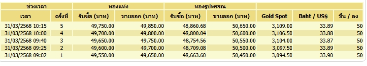 ด้านสมาคมค้าทองคำรายงาน ราคาทองคำไทยเช้านี้จนถึงเวลา 10.15 น. ปรับขึ้นแรงถึง 5 ครั้ง รวม 250 บาทต่อบาททองคำ ราคานิวไฮ ทองแท่งขายออกที่ 49,850 บาท ทองรูปพรรณ ขายออกบาทละ 50,650 บาท โดยทองราคา SPOT เอเชีย ขายออก 3,109 ดอลลาร์ต่อออนซ์ ค่าเงินบาทเคลื่อนไหว 33.89 บาท/ดอลลาร์สหรัฐ