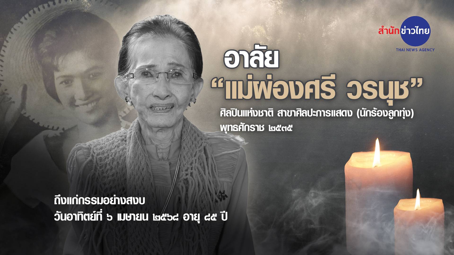 กทม. 6 เม.ย.- วงการบันเทิงเศร้า “ผ่องศรี วรนุช” ศิลปินแห่งชาติ ราชินีลูกทุ่งคนแรกของไทย จากไปอย่างสงบ ในวัย 85 ปี หลังป่วยมะเร็งปอดและเข้ารับการรักษามาระยะหนึ่ง