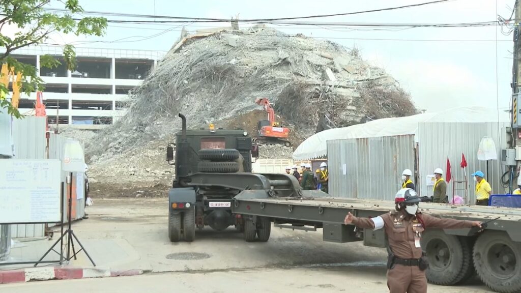 เมื่อ 10.30 น. วันนี้ เจ้าหน้าที่นำรถแบ็กโฮชนิดหัวเจาะ เข้าทำการเจาะแท่งปูนขนาดใหญ่บนยอดกองซากตึก สตง. พร้อมกับพร้อมกับฉีดน้ำเพื่อลดฝุ่นละอองฟุ้งกระจาย