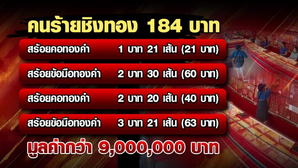 เจ้าของห้างทองดังกล่าว เล่าว่า ช่วงเกิดเหตุ พนักงานบอกให้ชายคนร้ายซึ่งคิดว่าเป็นลูกค้า ถอดหมวกแก๊ปออกตามกฎของร้าน แต่กลับชักปืนขู่ ทำให้พนักงานที่อยู่ด้านหลังเคาน์เตอร์วิ่งเข้าไปด้านหลังร้านทันที แล้วกดสัญญาณเตือนภัย ตรวจสอบความเสียหายเบื้องต้น สร้อยคอทองคำถูกชิงไปทั้งหมดน้ำหนัก 184 บาท ประกอบด้วย สร้อยคอทองคำ น้ำหนัก 1 บาท 21 เส้น (21 บาท) สร้อยข้อมือทองคำหนัก 2 บาท 30 เส้น (60 บาท) สร้อยคอทองคำ น้ำหนัก 2 บาท 20 เส้น (40 บาท) สร้อยข้อมือทองคำ หนัก 3 บาท 21 เส้น (63 บาท) รวมมูลค่ากว่า 9 ล้านบาท