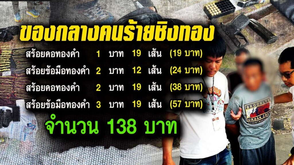 ส่วนของกลางทองรูปพรรณ 138 บาท ประกอบ ด้วยสร้อยคอทองคำ 1 บาท 19 เส้น สร้อยข้อมือทองคำ 2 บาท 12 เส้น รวม 24 บาท สร้อยคอทองคำ 2 บาท 19 เส้น รวม 38 บาท และ สร้อยข้อมือทองคำ 3 บาท 19 เส้น รวม 57 บาท ตำรวจได้นำไปตรวจนับอย่างละเอียดอีกครั้งและเตรียมส่งคืนร้านทองต่อไป
