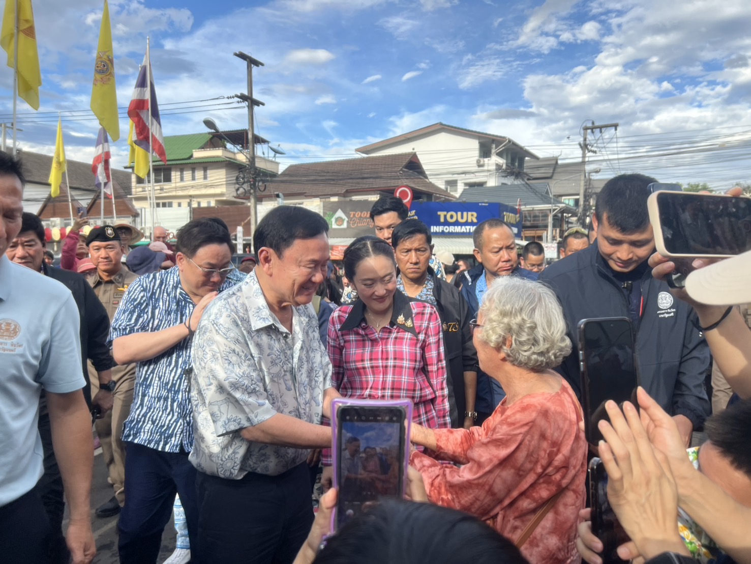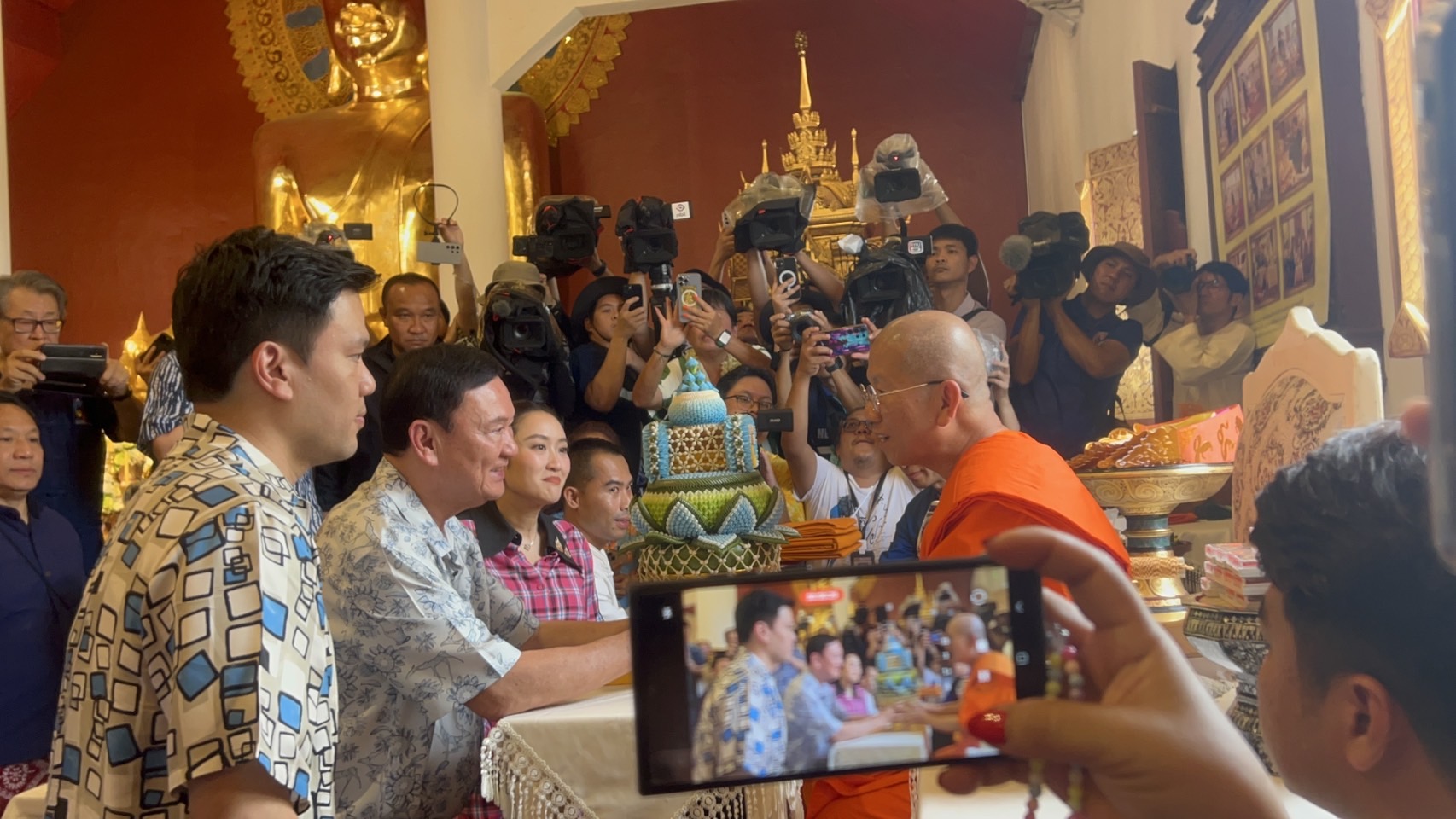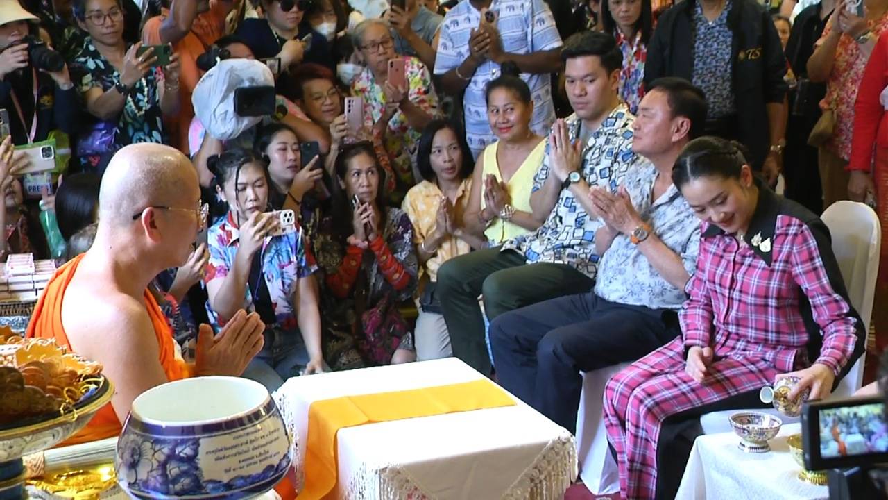 จากนั้น เจ้าอาวาส บอกว่า ช่วงปีใหม่ไทยแบบนี้ น.ส.ยิ่งลักษณ์ ชินวัตร และนายสมชาย วงศ์สวัสดิ์ อดีตนายกรัฐมนตรี ก็เคยมาที่วัดนี้ นายกรัฐมนตรี จึงกล่าวตอบว่า เป็นบ้านเกิด พร้อมกันนี้ เจ้าอาวาส ยังได้สอบถามนายทักษิณว่า สบายดีหรือไม่ ซึ่งนายทักษิณ กล่าวตอบกลับว่า อายุ 76 ปีแล้ว ก่อนที่เจ้าอาวาสจะพรมน้ำมนต์ให้นายกรัฐมนตรีและครอบครัว และมอบรูปหล่อพระสิงห์ ขนาด 1 นิ้ว เหรียญพระสมเด็จสิงหราช เนื้อผงกระเบื้อง ให้กับนายกรัฐมนตรี