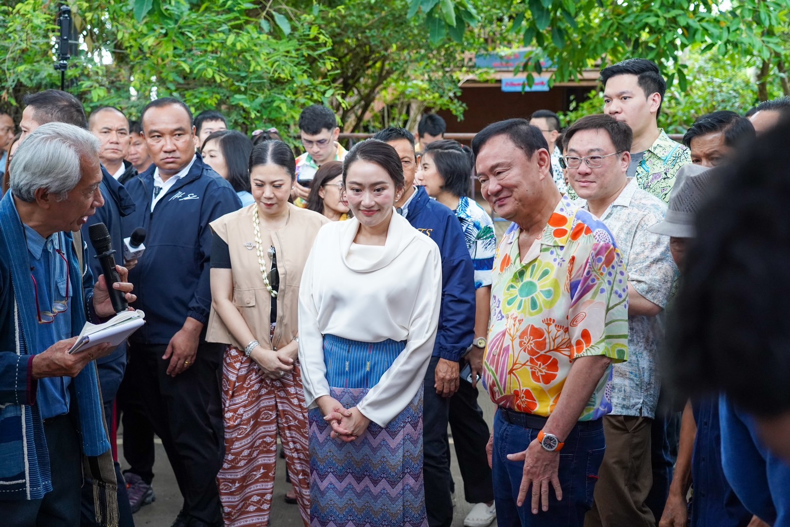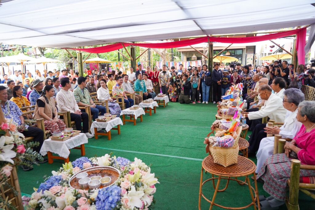 จากนั้น นายกรัฐมนตรี และ นายทักษิณ ได้ร่วมปักตุงล้านนา ประจำปีเกิด เพื่อเป็นสิริมงคลกับตัวเองตามความเชื่อของวัฒนธรรมล้านนา และกล่าวทักทายประชาชนที่มารอต้อนรับ เป็นภาษาเหนือ ว่า สวัสดีป้อแม่พี่น้องทุกคนเจ้า อู้เมืองบ่จ้าง คนอู้จ้างอยู่ตรงโน้น พร้อมกับผายมือไปที่นายทักษิณ ก่อนกล่าวว่า รู้สึกดีใจอย่างยิ่งที่ได้มาสันกำแพง ซึ่งถือเป็นที่ที่คุณพ่อโตมา และเมื่อก่อนเคยมาที่นี่ได้ได้ยินเรื่องเล่าเสมอ ว่า คุณพ่ออยู่ตึกแถว ขายกาแฟ และทำหวานเย็นขายห่อด้วยกระดาษหนังสือพิมพ์ ขณะนั้นราคา 2 บาท และตอนที่อยู่ต่างประเทศก็จะทำให้ทานอยู่บ่อยครั้ง ถือเป็นความผูกพันมาตั้งแต่เด็ก พร้อมขอขอบคุณทุกท่านที่มาร่วมงาน มาเจอกัน วันนี้ตั้งใจมาอวยพร ขอให้ทุกคนมีความสุข สุขกายสบายใจ สุขภาพแข็งแรง สงกรานต์เป็นเทศกาลที่ทุกคนกลับไปอยู่กับคนที่ตัวเองรัก และครอบครัว ขอให้ใช้เวลานี้ให้เต็มที่มากที่สุด ขอให้เดินทางไปไหนมาไหนปลอดภัย ปีใหม่ไทยนี้ขอให้จิตใจแจ่มใสเบิกบาน ชาร์จแบตตัวเองให้เต็มที่ พร้อมกลับไปทำงานอีกครั้ง และขอให้ประสบความสำเร็จ ร่ำรวยเงินทอง มีสุขภาพแข็งแรง มีความสุขในทุกวัน