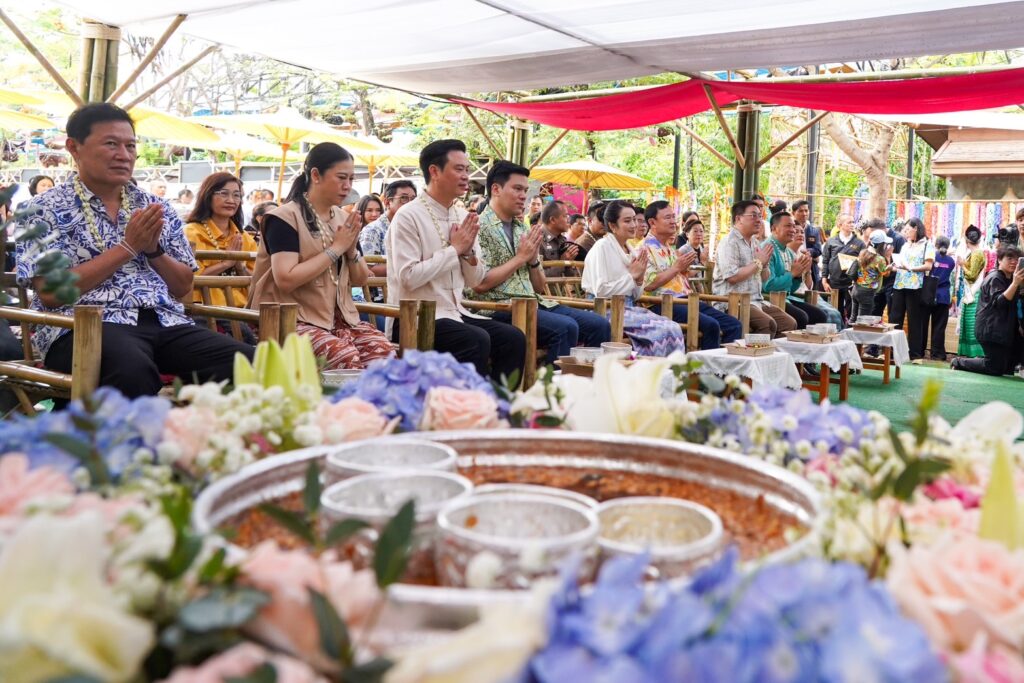 โดยนายกรัฐมนตรี ได้สวมใส่ชุดผ้าเมืองเหนือ มาร่วมงาน พร้อมถวายพวงมาลัยแด่หลวงพ่อสมปรารถนา จากวัดร้องวันแดง ซึ่งเป็นพระพุทธรูปคู่บ้านคู่เมืองของอำเภอสันกำแพง และร่วมพิธีสระเกล้าดำหัว หรือ พิธีรดน้ำดำหัวผู้สูงอายุ โดยหนึ่งในนั้นมีคุณย่าทองสุทธิ ชินวัตร ซึ่งเป็นย่าของนายกรัฐมนตรี