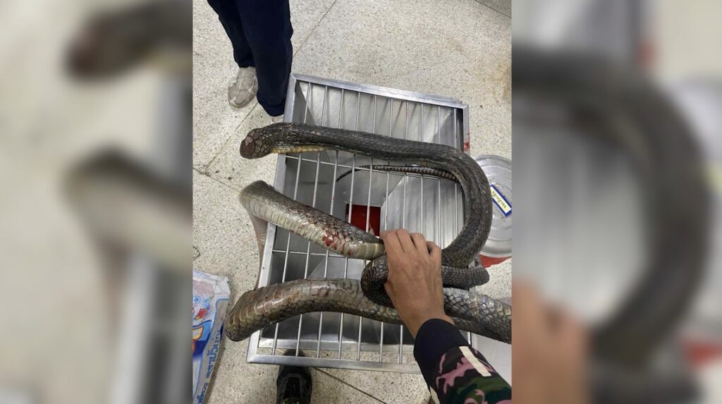 งูจงอางขนาดใหญ่ ชั่งน้ำหนักได้ 4.6 กิโลกรัม เห็นภาพงูนอนแน่นิ่งตายแบบนี้เพราะผ่านการต่อสู้กับคุณสุพิน อายุ 47 ปี มาก่อน
