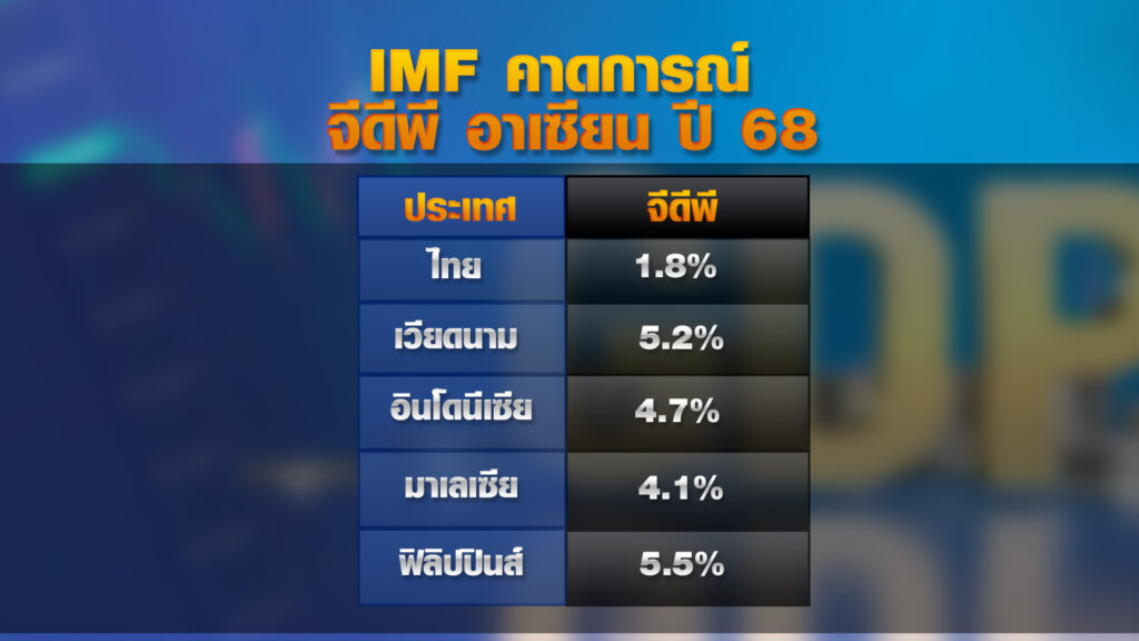ขณะที่กองทุนการเงินระหว่างประเทศ (IMF) ปรับลดคาดการณ์เศรษฐกิจโลกในปีนี้และปีหน้า โดยในรายงานแนวโน้มเศรษฐกิจโลก (WEO) ที่มีการเผยแพร่ล่าสุด (22 เม.ย.68) คาดการณ์ว่าเศรษฐกิจโลกจะขยายตัว 2.8% และ 3.0% ในปี 2568 และ 2569 ตามลำดับ จากเดิมที่คาดการณ์ไว้ที่ระดับ 3.3% สำหรับปี 2568 และ 2569 โดยคาดว่าเศรษฐกิจะได้รับผลกระทบจากมาตรการเรียกเก็บภาษีศุลกากรของสหรัฐฯ และยังปรับลดคาดการณ์จีดีพีกลุ่มประเทศ ASEAN-5 (อินโดนีเซีย มาเลเซีย ฟิลิปปินส์ สิงคโปร์ และไทย) ลดลง กระทบหนักที่สุดจากภาษีตอบโต้ของสหรัฐ โดยคาด “ไทย” จีดีพีปีนี้จะโตเพียงที่ 1.8% จากเดิมคาดโต 2.9% ส่วนปีหน้าคาดโตเพียง 1.6%