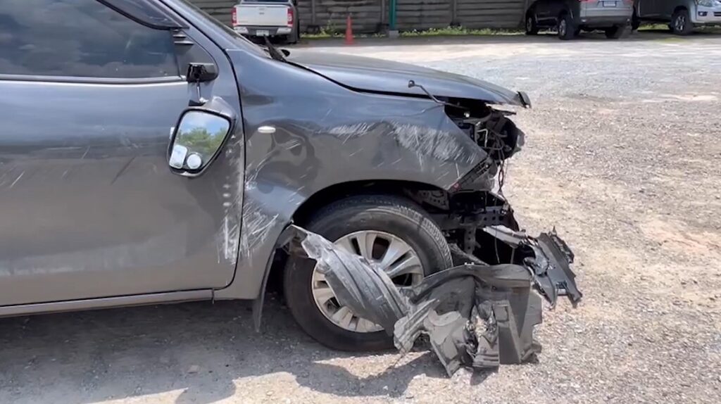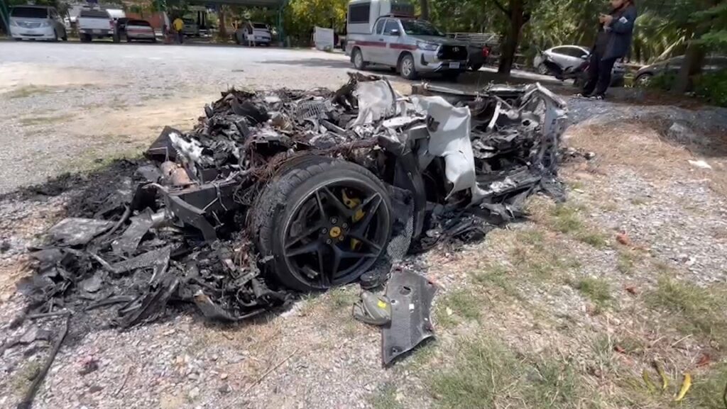 ผู้สื่อข่าวไปดูสภาพรถทั้ง 3 คันที่เกิดอุบัติเหตุ ซึ่งถูกนำมาจอดเก็บไว้ที่ สน.ธรรมศาลา พบซูเปอร์คาร์เฟอร์รารี่ รุ่น F8 TRIBUTO สีบรอนซ์เงิน อยู่ในสภาพถูกไฟไหม้เสียหายทั้งคันเหลือแต่ซากเหล็ก ไม่สามารถซ่อมแซมได้ สำหรับรถหรู เมอร์เซเดส-เบนซ์ รุ่น C 220 สีบรอนซ์เงิน ถูกไฟไหม้เสียหายทั้งหมดเช่นกัน และบริเวณซุ้มล้อหลังฝั่งซ้ายมีชุดจานเบรกของซูเปอร์คาร์ติดคาอยู่ ขณะเดียวกันรถกระบะตู้ทึบ ฝากระโปรงหน้าเสียหาย