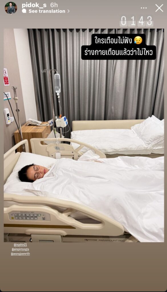 ขณะที่เมื่อคืนนี้นายปิฎก สุขสวัสดิ์ สามี ได้โพสต์ภาพลงในไอจีสตอรี่เป็นภาพนางสาวแพทองธาร ชินวัตร นายกรัฐมนตรี นอนแอดมิทอยู่ที่โรงพยาบาล พร้อมลงเวลา 01.43 น. และระบุข้อความว่า “ใครเตือนไม่ฟังร่างกายเตือนแล้วไม่ไหว” .314, 316.-สำนักข่าวไทย
