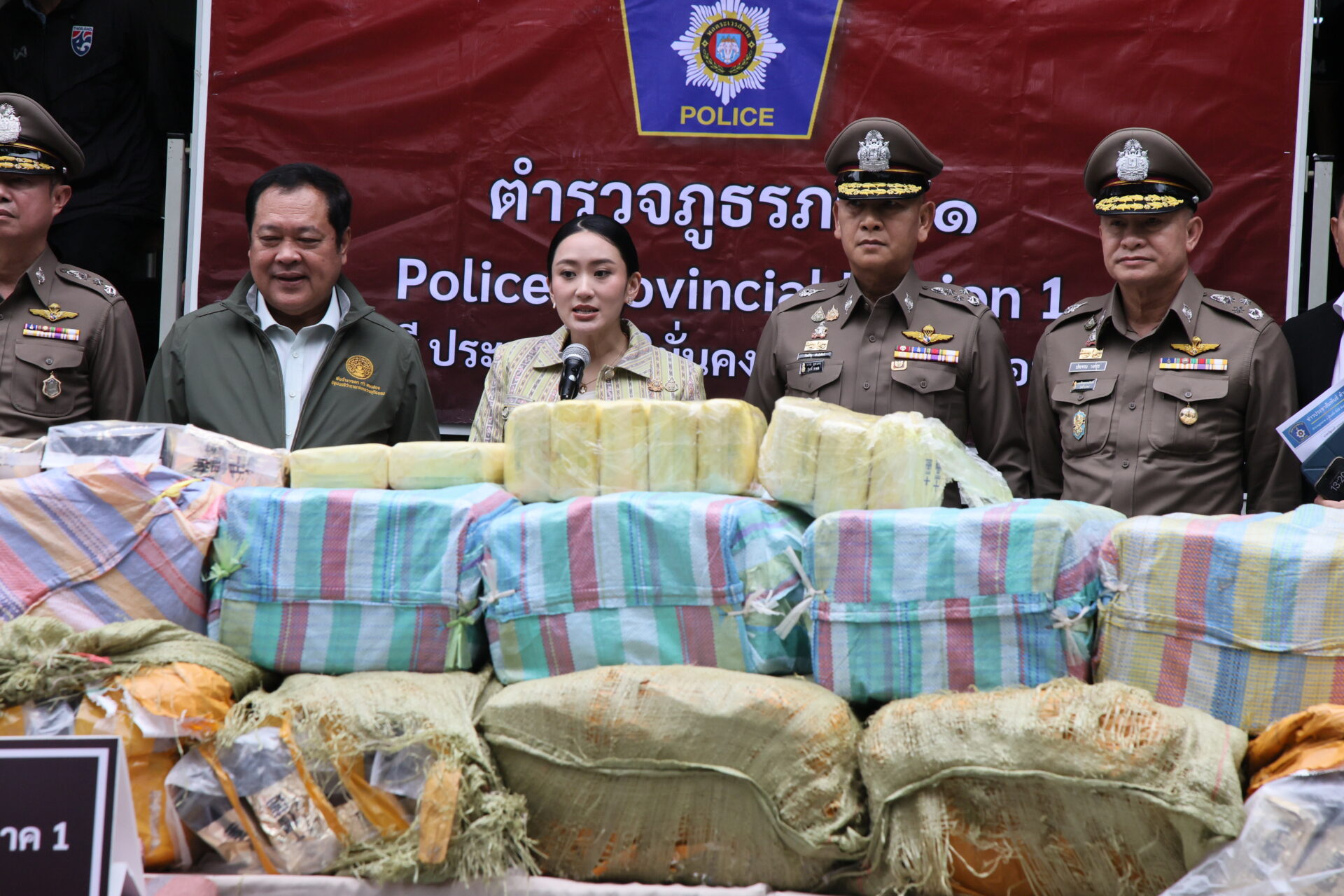 นางสาวแพทองธาร ชินวัตร นายกรัฐมนตรี พร้อมด้วย พ.ต.อ.ทวี สอดส่อง รัฐมนตรีว่าการกระทรวงยุติธรรม, พล.ต.อ.กิตติ์รัฐ พันธุ์เพ็ชร์ ผู้บัญชาการตำรวจแห่งชาติ, พล.ต.อ.ประจวบ วงศ์สุข รองผู้บัญชาการตำรวจแห่งชาติ, พล.ต.ท.สุรพล เปรมบุตร ผู้บัญชาการตำรวจภูธรภาค 1 และพล.ต.ท.ภาณุรัตน์ หลักบุญ เลขาธิการ ป.ป.ส.ร่วมแถลงข่าวการจับกุมผู้ต้องหาที่เกี่ยวข้องกับยาเสพติดรายสำคัญ ที่บริเวณหน้าอาคาร ที่ทำการ ตำรวจภูธรภาค 1
