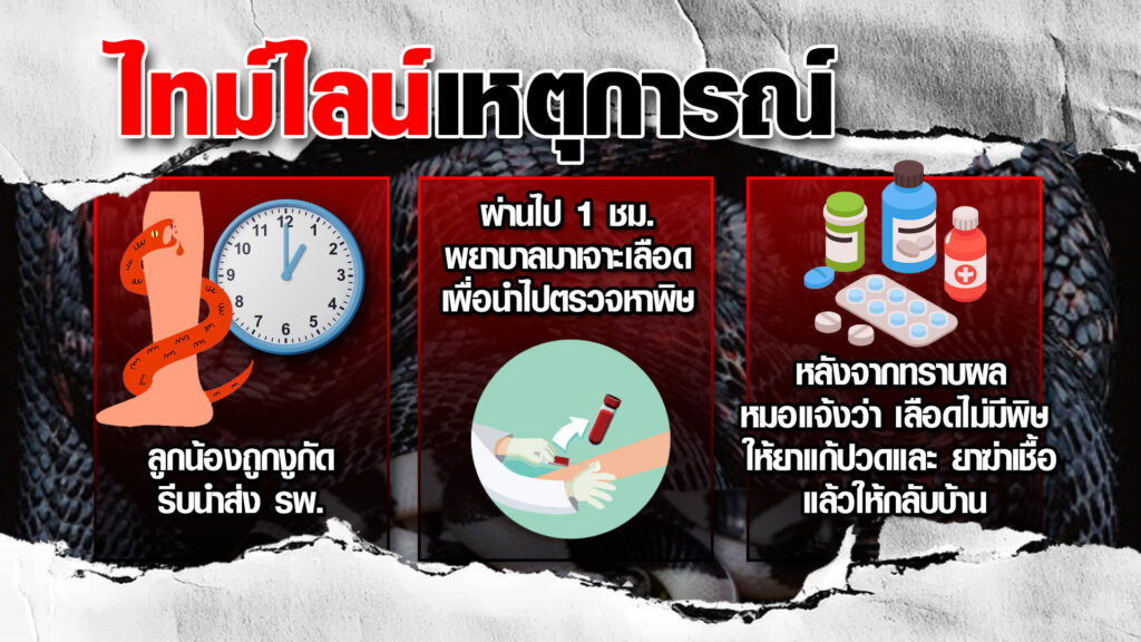 วานนี้ (8พ.ค.) มีผู้ใช้เฟซบุ๊กรายหนึ่ง เล่าเหตุการณ์ ลูกน้องโดนงูกัดตั้งแต่ตีหนึ่ง พอไปหาหมอที่โรงพยาบาล หมอเจาะเลือด หมอบอกให้กลับบ้าน เพราะในเลือดไม่มีพิษ แถมพูดกับแม่ของลูกน้องว่า “ไม่ใช่เคสสำคัญ ให้ยาและให้กลับบ้านได้เลย” ยาที่ได้ คือพารากับยาฆ่าเชื้อ แล้วบอกกับแม่ว่า 9 โมงให้มาใหม่ สุดท้ายยังไม่ทัน 9 โมงเลย ลูกน้องพูดไม่ได้ หายใจไม่ออก ลิ้นคับปาก ตาหลับ ลืมตาไม่ขึ้น จึงรีบหามส่งโรงพยาบาล สรุปแล้วไปเจาะเลือดใหม่ ผลออกมามีพิษ โดนงูมีพิษกัด ชีวิตคนๆ หนึ่งคุณทำได้สะเพร่าขนาดนี้ พอเห็นสภาพลูกน้องแล้วไม่ไหวจริงๆ อย่าให้เกิดเคสแบบนี้กับใครอีกนะ ชีวิตของทุกคนมีค่าเหมือนชีวิตของพวกคุณแหละ” ซึ่งงูที่กัด ทราบว่าคือ งูทับสมิงคลา