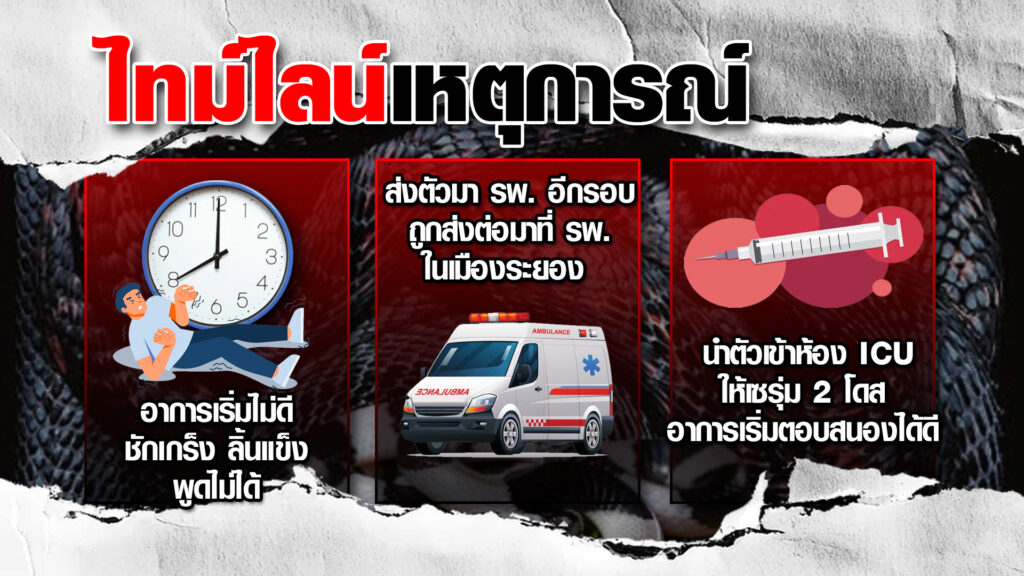 ช่วงเช้ามารดาสังเกตว่า ผู้ป่วยมีหนังตาตก กลืนลำบาก ดูซึมลง จึงพาไปโรงพยาบาล เวลา 08.14 น. ผู้ป่วยพูดคุยได้ แจ้งว่า มีอาการปากชา ลิ้นชา ประมาณเวลา 06.00 น. แพทย์ตรวจร่างกายพบว่า การหายใจปกติ ความเข้มข้นของออกซิเจนในเลือดปกติ มีอาการหนังตาตก ซึ่งเป็นอาการแสดงของพิษทางระบบประสาท จึงวินิจฉัยว่า ถูกงูที่มีพิษกัด และใส่ท่อช่วยหายใจป้องกันกล้ามเนื้อหายใจอ่อนแรง พร้อมทั้งประสานส่งต่อ รพ.ระยอง เพื่อให้เซรุ่มต้านพิษ อาการล่าสุดเช้าวานนี้ (8 พฤษภาคม 2568) ผู้ป่วยสัญญาณชีพปกติ ยังคงใส่ท่อช่วยหายใจอยู่ในห้องไอซียู เพื่อติดตามอาการอย่างใกล้ชิด