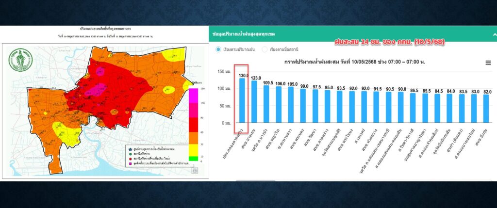 นายสมควร ต้นจาน ผู้อำนวยการกองพยากรณ์อากาศ กรมอุตุนิยมวิทยา เปิดเผยว่า ปริมาณฝนสะสมในกรุงเทพมหานครตลอด 24 ชั่วโมงที่ผ่านมา (10 พฤษภาคม เวลา 07.00 น. – 11 พฤษภาคม เวลา 07.00 น.) สูงสุดที่บริเวณปตร. คลองลาดพร้าว 130.0 มิลลิเมตร รองลงมาคือ สถานีบางเขน 123.0 มิลลิเมตร คลองบางบัว 109.5 มิลลิเมตร สำนักงานเขตพญาไท 106.0 มิลลิเมตร และจุดวัดสะพานขวา 105.0 มิลลิเมตร