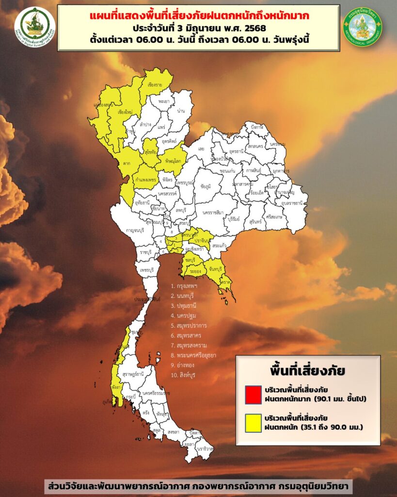 กทม. 3 มิ.ย.- กรมอุตุฯ เตือนมรสุมพัดปกคลุมประเทศไทย ส่งผลให้ยังมีฝนฟ้าคะนองและตกหนักบางแห่ง ทะเลอันดามันคลื่นสูง 2 เมตร