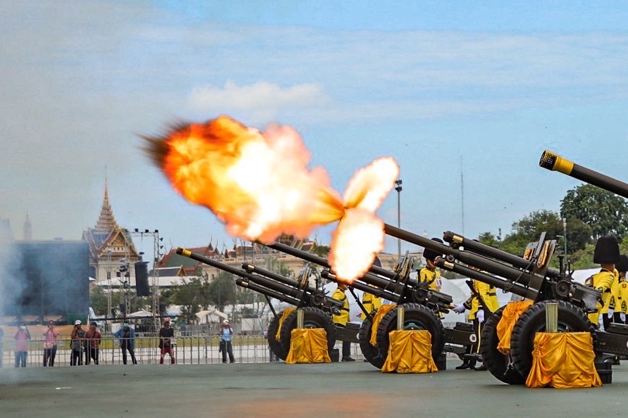 โดยกองร้อยปืนใหญ่ยิงสลุต ใช้ปืนใหญ่เบากระสุนวิถีราบ แบบ 80 ขนาด 75 มิลลิเมตร จำนวน 4 กระบอก ทำการยิงตามจังหวะของเพลงสรรเสริญพระบารมี จำนวน 21 นัด จังหวะ 5 วินาที ทีละกระบอก นับรอบจากขวาไปซ้าย ใช้เวลายิงทั้งหมด 1 นาที 40 วินาที ซึ่งจะดำเนินการยิงสลุตหลวง โดยพร้อมเพรียงกันทั้ง 3 เหล่าทัพ