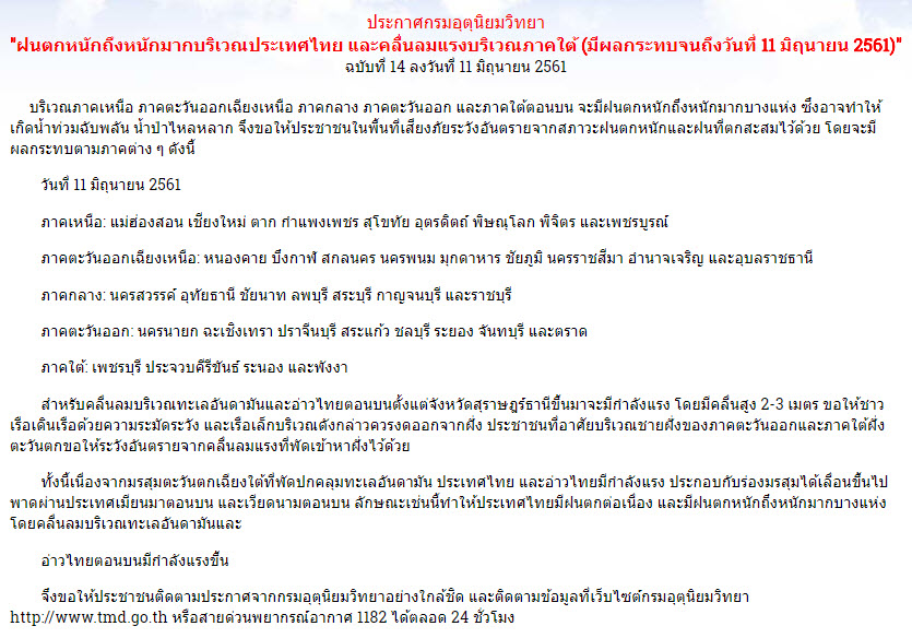 กรมอุตุนิยมวิทยา เตือนประเทศไทยยังคงมีฝนตกต่อเนื่อง กับมีฝนตกหนักบางแห่งบริเวณภาคเหนือ ภาคตะวันออกเฉียงเหนือ ภาคกลาง ภาคตะวันออก และภาคใต้ตอนบน ขอให้ประชาชนบริเวณดังกล่าวระวังอันตรายจากฝนที่ตกหนักถึงหนักมากบางแห่ง อาจเกิดน้ำท่วมฉับพลัน น้ำป่าไหลหลาก ทะเลอันดามันและอ่าวไทยตอนบนมีคลื่นสูง 2-3 เมตร ส่วนกรุงเทพฯ และปริมณฑล มีเมฆมากกับมีฝนฟ้าคะนอง ร้อยละ 70 ของพื้นที่ .
