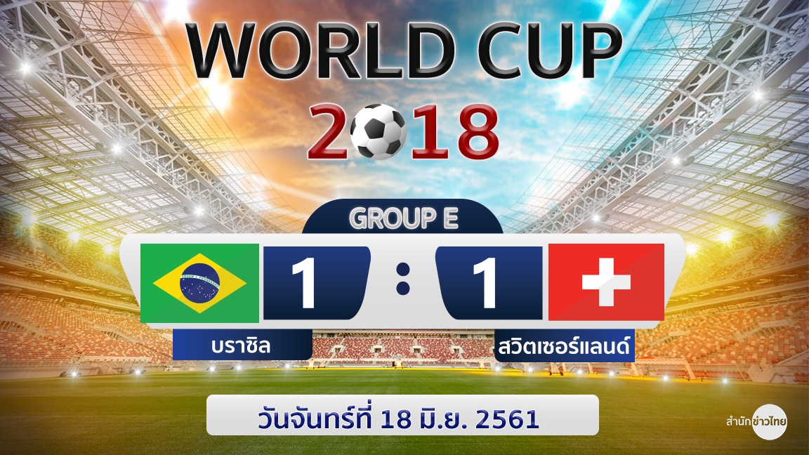 ผลฟุตบอลโลก 2018 กลุ่มอี บราซิล พบ สวิตเซอร์แลนด์ โดย “แซมบ้า” จัดชุดใหญ่ ทั้งเนย์มาร์, วิลเลี่ยน และฟิลิปเป้ คูตินโญ ในนาทีที่ 20 บราซิลได้ประตูขึ้นนำจากฟิลิปเป้ คูตินโญ จากจังหวะยิงไกลนอกกรอบเขตโทษ บอลพุ่งเบียดเสาไกลเข้าประตูไปอย่างงดงาม แต่จากนั้นนาทีที่ 50 สตีเวน ซูเบอร์ ขึ้นโหม่งจากลูกเตะมุมเข้าประตูไป จบเกมเสมอกัน 1-1 แบ่งกันทีมละ 1 คะแนน
