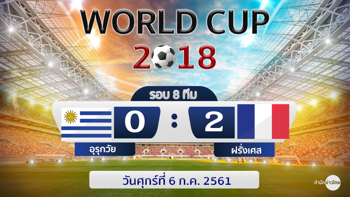 ฟุตบอลโลก รอบ 8 ทีมสุดท้าย อุรุกวัย แพ้ 0-2 ฝรั่งเศส ราฟาแอล วาราน ยิงให้ฝรั่งเศส ขึ้นนำ นาที 41 ก่อนอ็องตวน กรีซมันน์ จะยิงประตูที่ 2 นาที 61 ทำให้ฝรั่งเศสผ่านเข้ารอบรองชนะเลิศ ไปรอพบผู้ชนะระหว่าง บราซิล และเบลเยียม ที่จะแข่งขัน เวลา 01.00 น.