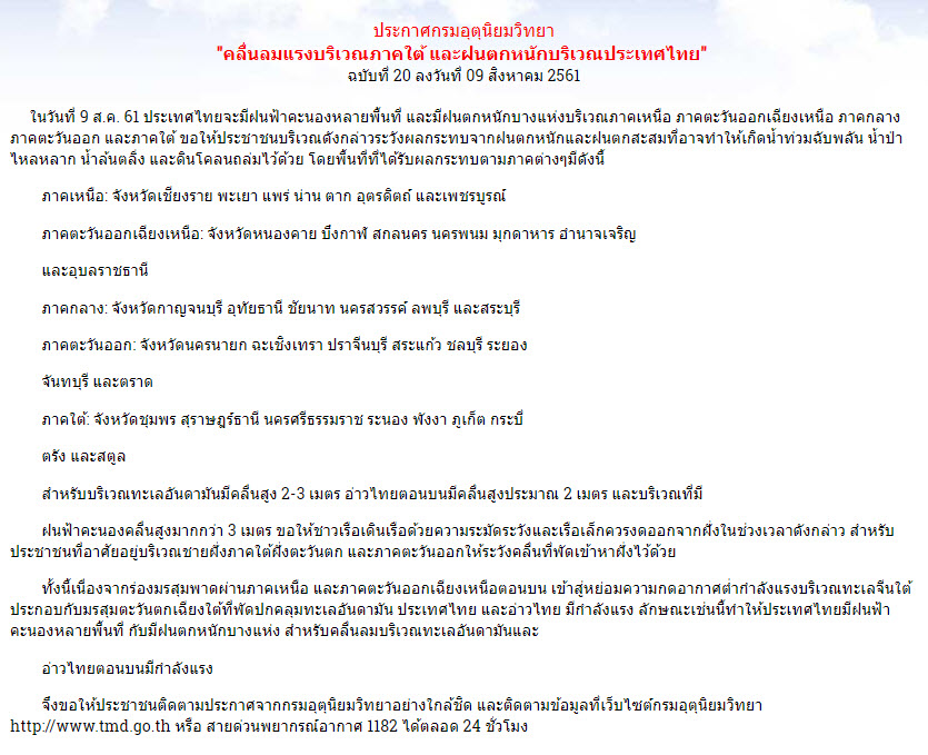 กรมอุตุนิยมวิทยาเตือนประเทศไทยมีฝนฟ้าคะนองหลายพื้นที่ กับมีฝนตกหนักบางแห่งบริเวณภาคเหนือ ภาคตะวันออกเฉียงเหนือ ภาคกลาง ภาคตะวันออก และภาคใต้ ขอให้ประชาชนระวังอันตรายจากฝนตกหนักและฝนที่ตกสะสม อาจทำให้เกิดน้ำท่วมฉับพลัน น้ำป่าไหลหลากไว้ด้วย ทะเลคลื่นสูง กรุงเทพฯ และปริมณฑล ฝนฟ้าคะนอง ร้อยละ 70 ของพื้นที่ .