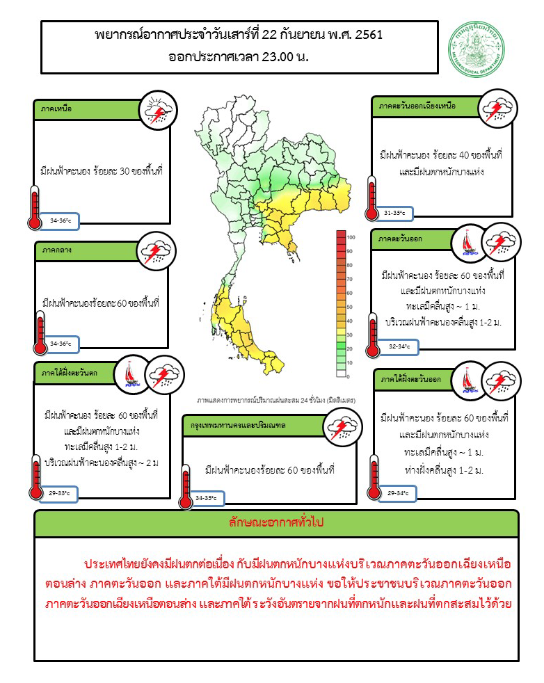 กรมอุตุฯ เผยภาคอีสานตอนล่าง-ตะวันออก มีฝนตกหนัก ส่วน กทม.-ปริมณฑล ฝนฟ้าคะนอง 40% ของพื้นที่ อนึ่ง พายุไต้ฝุ่น “จ่ามี” บริเวณมหาสมุทรแปซิฟิก มีแนวโน้มจะเคลื่อนขึ้นฝั่งบริเวณเกาะไต้หวัน ในช่วงวันที่ 28-30 ก.ย. ขอให้ผู้ที่จะเดินทางไปบริเวณดังกล่าวตรวจสอบสภาพอากาศก่อนเดินทาง โดยพายุนี้ไม่มีผลกระทบต่อประเทศไทย