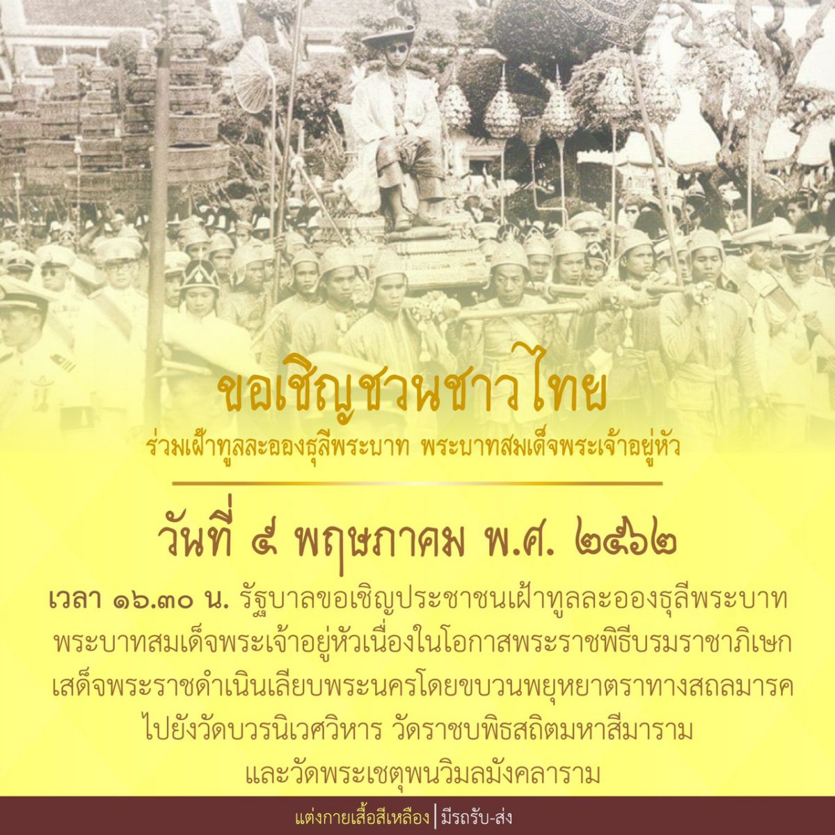 รัฐบาลขอเชิญชวนชาวไทยทุกหมู่เหล่า ร่วมเฝ้าทูลละอองธุลีพระบาทรับเสด็จพระบาทสมเด็จพระเจ้าอยู่หัว ในโอกาสเสด็จพระราชดำเนินเลียบพระนคร โดยขบวนพยุหยาตราทางสถลมารค ไปยังวัดบวรนิเวศวิหาร วัดราชบพิธสถิตมหาสีมาราม และวัดพระเชตุพนวิมลมังคลาราม วันที่ ๕ พฤษภาคม พุทธศักราช ๒๕๖๒ .