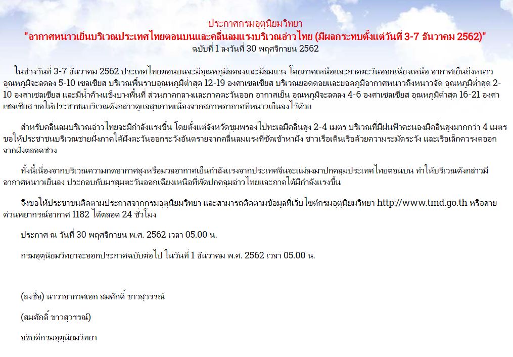 อุตุฯ เผยไทยตอนบนมีอากาศเย็นกับมีหมอกในตอนเช้า ช่วงวันที่ 3-7 ธ.ค. ภาคเหนือ-อีสาน อากาศจะเย็นลงอีก 5-10 องศาฯ บริเวณยอดดอยและยอดภูมีอากาศหนาวถึงหนาวจัด อุณหภูมิต่ำสุด 2-10 องศาฯ และมีน้ำค้างแข็งบางพื้นที่ ส่วนคลื่นลมบริเวณอ่าวไทยมีกำลังแรงขึ้น ตั้งแต่ จ.ชุมพร ลงไป คลื่นสูง 2-4 เมตร.