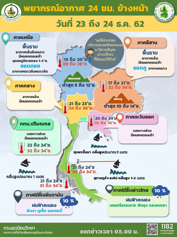 กรมอุตุนิยมวิทยา พยากรณ์อากาศ 24 ชั่วโมงข้างหน้า ประเทศไทยตอนบนมีอากาศเย็นถึงหนาวกับมีหมอกในตอนเช้า อุณหภูมิจะลดลง 1-2 องศาเซลเซียส ในภาคเหนือและภาคตะวันออกเฉียงเหนือตอนบน ส่วนตอนกลางวันท้องฟ้าโปร่งและมีแดดจัด ยอดดอยและยอดภูมีอากาศหนาวถึงหนาวจัด อุณหภูมิต่ำสุด 5-14 องศาเซลเซียส สำหรับภาคใต้มีฝนฟ้าคะนองบางพื้นที่ ส่วนกรุงเทพฯ และปริมณฑล มีเมฆบางส่วน กับมีหมอกในตอนเช้า อุณหภูมิต่ำสุด 23-25 องศาเซลเซียส อุณหภูมิสูงสุด 34-36 องศาเซลเซียส .