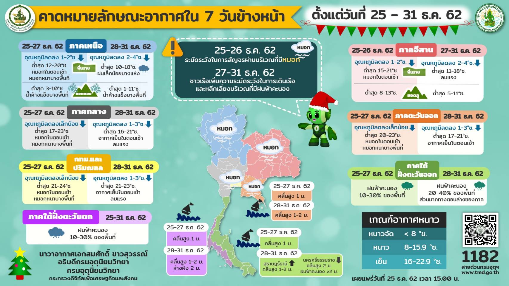 อุตุฯ เผยไทยตอนบนมีอากาศเย็นถึงหนาวกับมีหมอกในตอนเช้าและมีหมอกหนาในบางพื้นที่ ภาคเหนือ-อีสาน อุณหภูมิต่ำสุด 14-22 องศาฯ บริเวณยอดดอย-ยอดภู อากาศหนาวถึงหนาวจัด อุณหภูมิต่ำสุด 4-13 องศาฯ มีน้ำค้างแข็งบางแห่ง ส่วนพายุไต้ฝุ่น “ฟานทอง” บริเวณทะเลจีนใต้ตอนกลาง คาดจะอ่อนกำลังลงและสลายตัวช่วงวันที่ 28-29 ธ.ค. พายุนี้ไม่มีผลกระทบต่อลักษณะอากาศของไทย.