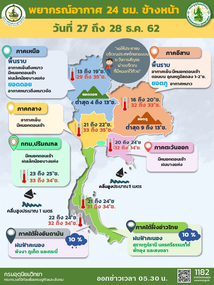 กรมอุตุนิยมวิทยา เผยภาคเหนือมีฝนบางพื้นที่ ไทยตอนบนมีอากาศเย็นถึงหนาว ภาคเหนือและภาคตะวันออกเฉียงเหนือ อุณหภูมิลดลง 1-3 องศาเซลเซียส ส่วนภาคกลาง ภาคตะวันออก รวมทั้งกรุงเทพมหานคร และปริมณฑล จะมีอุณหภูมิลดลง 1-2 องศาเซลเซียส ยอดดอยและยอดภูมีอากาศหนาวถึงหนาวจัด อุณหภูมิต่ำสุด 3-13 องศาเซลเซียส สำหรับภาคใต้มีฝนเพิ่มขึ้น และคลื่นลมบริเวณอ่าวไทยจะมีคลื่นสูงประมาณ 2 เมตร.