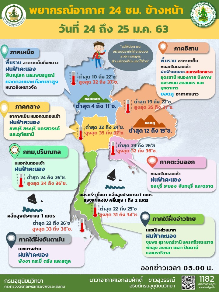 กรมอุตุนิยมวิทยา ประกาศเตือนอากาศแปรปรวนบริเวณประเทศไทยตอนบน ช่วงวันที่ 24-27 ม.ค. จะมีฝนฟ้าคะนองกับลมกระโชกแรงเกิดขึ้นในระยะแรกในภาคเหนือและภาคตะวันออกเฉียงเหนือ หลังจากนั้นอุณหภูมิจะลดลง 6-8 องศาฯ กับมีอากาศหนาว ยอดดอยหนาวจัด อุณหภูมิต่ำสุด 1-13 องศาเซลเซียส มีน้ำค้างแข็ง ส่วนภาคกลาง อุณหภูมิลดลง 2-4 องศาเซลเซียส.