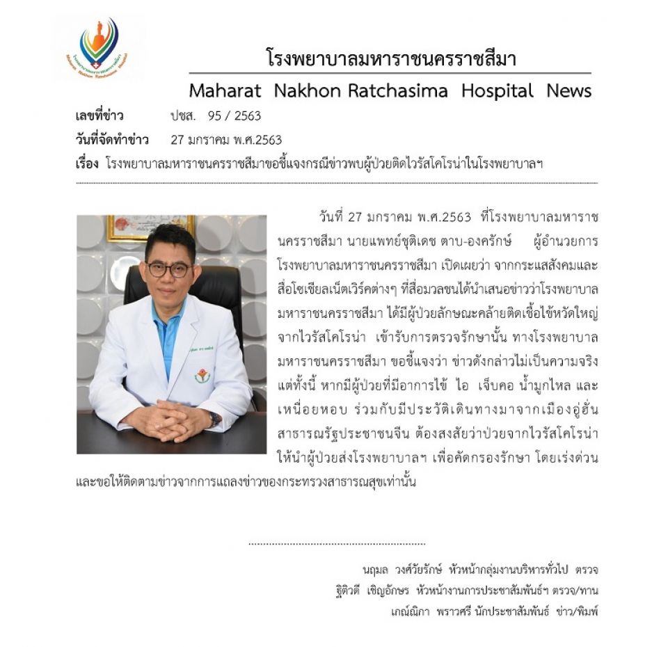 นพ.ชุติเดช ตาบ-องครักษ์ ผู้อำนวยการโรงพยาบาลมหาราชนครราชสีมา ออกเอกสารแถลงข้อเท็จจริงกรณีมีกระแสข่าวและสื่อโซเชียลระบุถึงผู้ป่วยอาการคล้ายติดเชื้อไวรัสโคโรนาอยู่ในโรงพยาบาลนั้น ขอชี้แจงว่า ข่าวดังกล่าวไม่เป็นความจริง แต่หากมีผู้ป่วยที่มีอาการไข้ ไอ เจ็บคอ มีน้ำมูก และเหนื่อยหอบ ร่วมกับมีประวัติเดินทางมาจากเมืองอู่ฮั่น ต้องสงสัยว่าป่วยจากไวรัสโคโรนา ให้นำผู้ป่วยส่งโรงพยาบาลฯ เพื่อคัดกรองรักษาโดยเร่งด่วน และขอให้ติดตามข้อมูลข่าวสารจากกระทรวงสาธารณสุขเท่านั้น