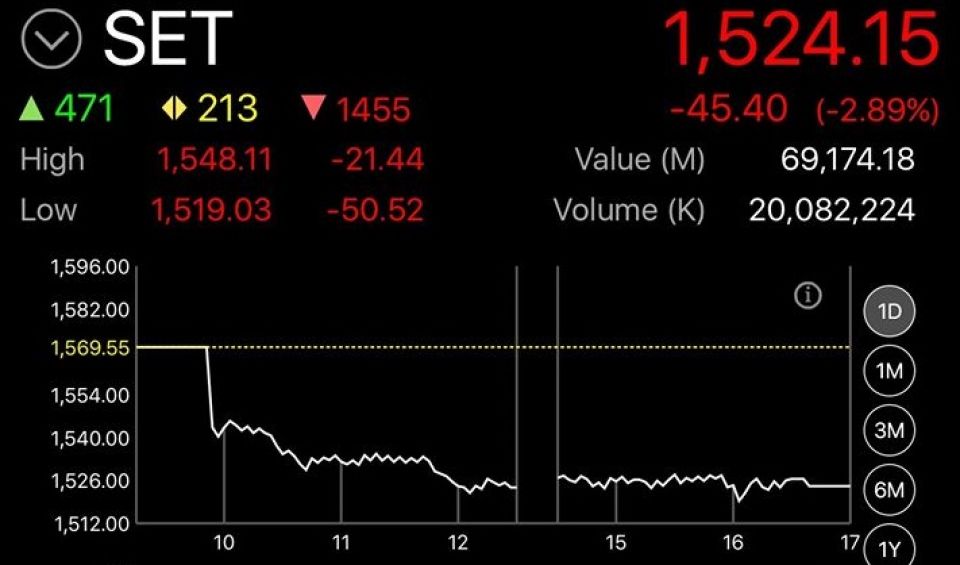 ตลาดหลักทรัพย์ปิดวันนี้ที่ระดับ 1,524.15 จุด ลดลง 45.40 จุด มูลค่าการซื้อขาย 69,174.18 ล้านบาท โดยวีระวัฒน์ วิโรจน์โภคา ผู้อำนวยการฝ่ายวิเคราะห์หลักทรัพย์ บล.ฟินันเซีย ระบุตลาดหุ้นไทยปรับตัวลง เพราะนักลงทุนกังวลสถานการณ์เชื้อไวรัสโคโรนาสายพันธุ์ใหม่แพร่ระบาด
