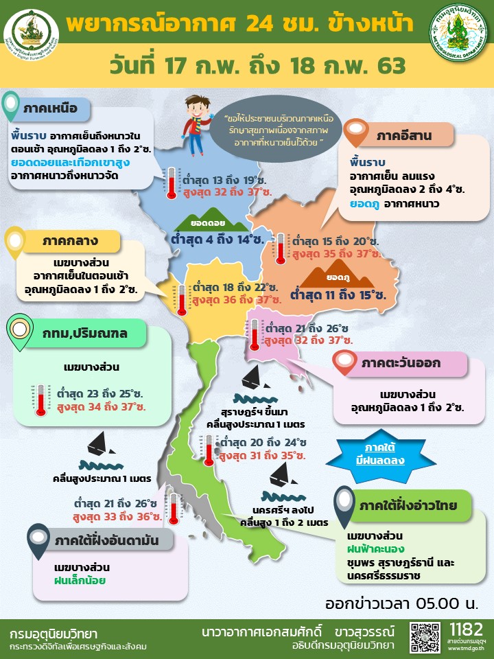 กรมอุตุฯ เตือนช่วงวันที่ 17-19 ก.พ. ไทยตอนบนมีอากาศเย็นถึงหนาว กับมีลมแรง ภาคอีสานอุณหภูมิลดลง 4-6 องศาฯ ส่วนภาคเหนือ ภาคกลาง และภาคตะวันออก อุณหภูมิลด 1-3 องศาฯ สำหรับภาคใต้มีฝนเพิ่มขึ้น อ่าวไทยตอนล่างคลื่นสูง 2-3 เมตร ขอให้ชาวเรือระมัดระวังในการเดินเรือ เรือเล็กควรงดออกจากฝั่งถึงวันที่ 20 ก.พ.