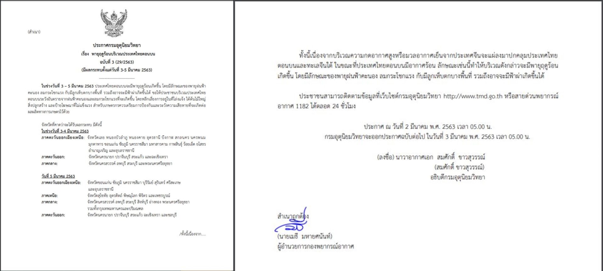 กรมอุตุฯ พยากรณ์อากาศ 24 ชม.ข้างหน้า ไทยตอนบนมีอากาศร้อนในตอนกลางวัน โดยมีฝนฟ้าคะนองบางพื้นที่บริเวณภาคเหนือตอนล่าง อีสาน กลาง ตะวันออก และใต้ เตือนช่วงวันที่ 3-5 มี.ค.63 ไทยตอนบนจะมีพายุฤดูร้อนเกิดขึ้น โดยมีลักษณะของพายุฝนฟ้าคะนอง ลมกระโชกแรง กับมีลูกเห็บตกบางพื้นที่ รวมถึงอาจจะมีฟ้าผ่าเกิดขึ้นได้