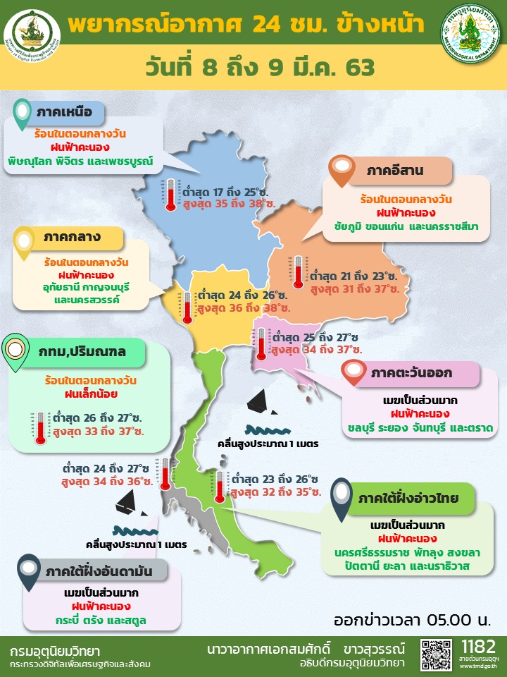 กรมอุตุนิยมวิทยา พยากรณ์อากาศ 24 ชั่วโมงข้างหน้า ประเทศไทยตอนบนมีอากาศร้อนในตอนกลางวันกับมีฝนฟ้าคะนองบางพื้นที่ ในภาคเหนือตอนล่าง ภาคตะวันออกเฉียงเหนือ ภาคกลาง ภาคตะวันออก และภาคใต้ กรุงเทพฯ และปริมณฑล อากาศร้อนในตอนกลางวัน กับมีฝนเล็กน้อยบางแห่ง อุณหภูมิต่ำสุด 26-27 องศาเซลเซียส อุณหภูมิสูงสุด 33-37 องศาเซลเซียส .