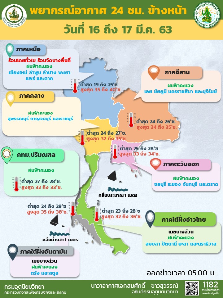 กรมอุตุนิยมวิทยา พยากรณ์อากาศ 24 ชั่วโมงข้างหน้า ภาคเหนือมีอากาศร้อนถึงร้อนจัด โดยมีฝนฟ้าคะนองบริเวณภาคเหนือ ภาคตะวันออกเฉียงเหนือ ภาคตะวันออก และภาคกลาง ขอให้ประชาชนบริเวณประเทศไทยตอนบนระวังอันตรายจากฝนฟ้าคะนองที่เกิดขึ้นในระยะนี้ไว้ด้วย กรุงเทพฯ และปริมณฑล มีฝนฟ้าคะนอง ร้อยละ 10 ของพื้นที่ อุณหภูมิต่ำสุด 27-28 องศาเซลเซียส อุณหภูมิสูงสุด 32-33 องศาเซลเซียส ลมใต้ ความเร็ว 10-20 กม./ชม.