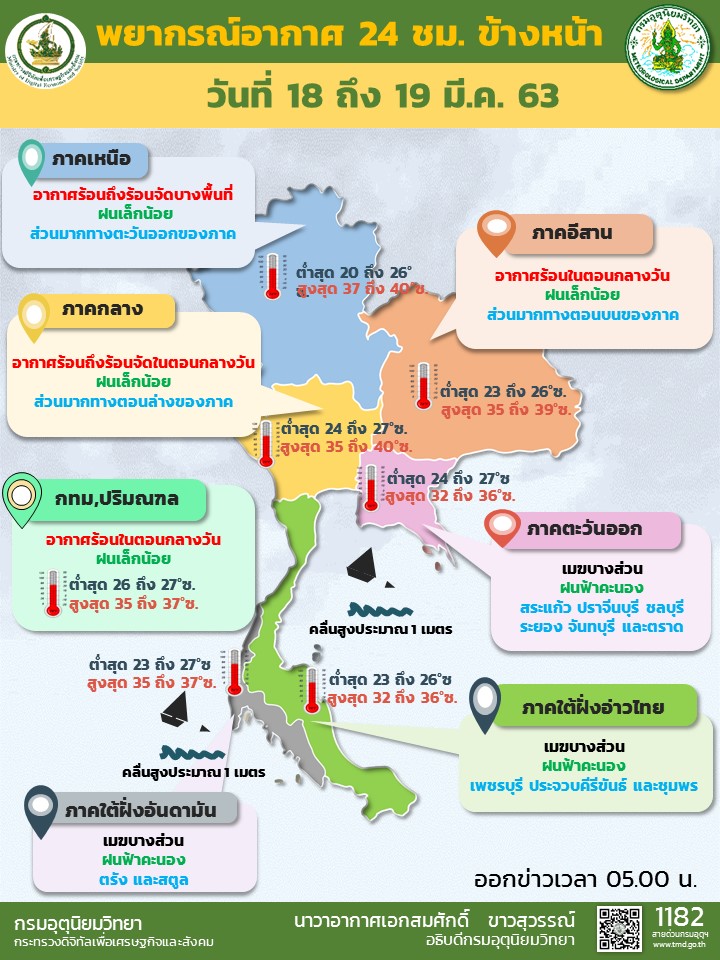 กรมอุตุนิยมวิทยา พยากรณ์อากาศ 24 ชั่วโมงข้างหน้า ประเทศไทยตอนบนมีอากาศร้อนโดยทั่วไปกับมีอากาศร้อนจัดบางพื้นที่ โดยมีแนวโน้มฝนฟ้าคะนองลดลง ส่วนกรุงเทพมหานครและปริมณฑล อากาศร้อนในตอนกลางวัน กับมีฝนเล็กน้อยบางแห่ง อุณหภูมิต่ำสุด 26-27 องศาเซลเซียส อุณหภูมิสูงสุด 35-37 องศาเซลเซียส.