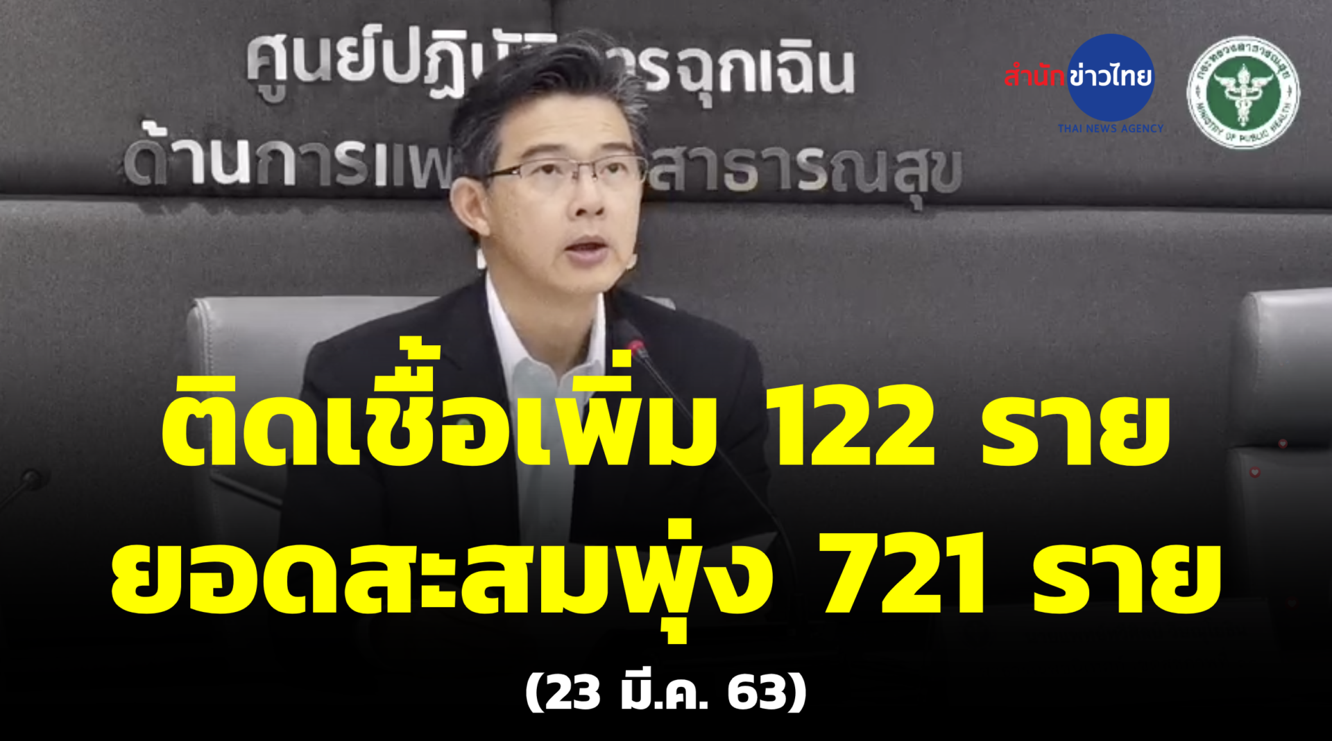 กระทรวงสาธาณสุขแถลงสถานการณ์โรคโควิด-19 วันนี้ 23 มี.ค.63 พบผู้ป่วยเพิ่ม 122 ราย ยอดสะสมพุ่ง 721 ราย ห่วงคนกรุงแห่กลับ ตจว. แพร่เชื้อ ขอเคร่งครัดกักตัว 14 วัน