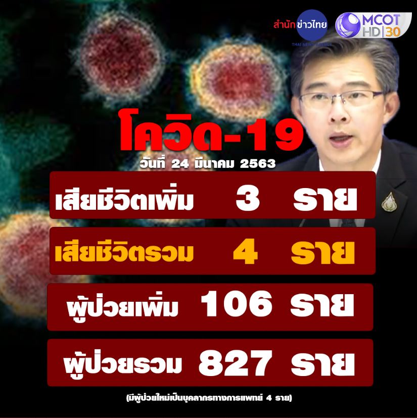 สำนักข่าวไทย : 24 มี.ค. 63 – กระทรวงสาธาณสุขแถลงสถานการณ์โรคโควิด-19 วันนี้ 24 มี.ค. 63 พบผู้ป่วยเพิ่ม 106 ราย ยอดสะสมพุ่ง 827 ราย มีบุคลากรทางการแพทย์ติดเชื้อ 4 ราย