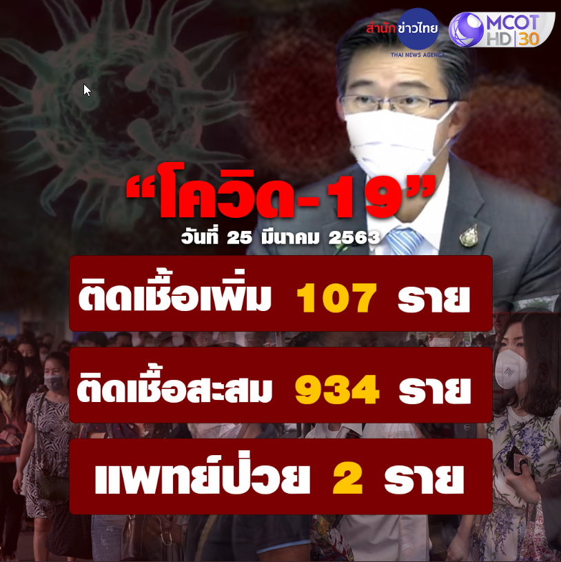 สำนักข่าวไทย : 25 มี.ค. 63 – กระทรวงสาธาณสุขแถลงสถานการณ์โรคโควิด-19 วันนี้ 25 มี.ค. 63 พบผู้ป่วยเพิ่ม 107 ราย ยอดสะสมพุ่ง 934 ราย มีแพทย์ติดเชื้อ 2 ราย